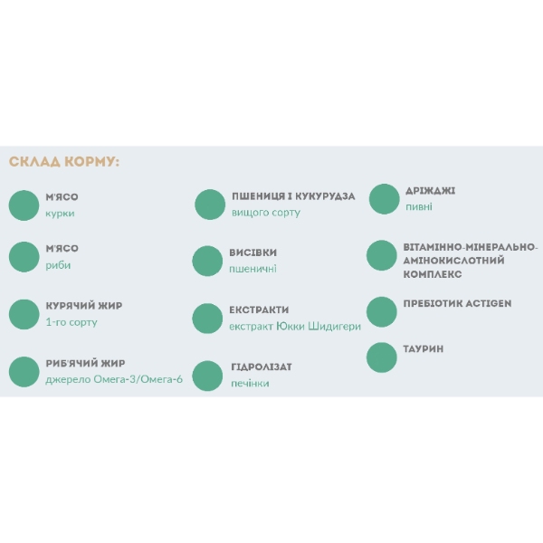 Для блеска шерсти и эластичности кожи гранула наполнена оптимальным количеством рыбьего жира (источник Омега-3 и Омега-6)
